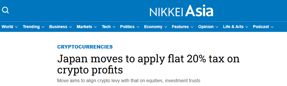 日本政府支持对加密货币利润征收20%税率,与股票持平