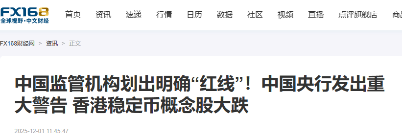 中国监管机构划出明确“红线”!香港稳定币概念股大跌