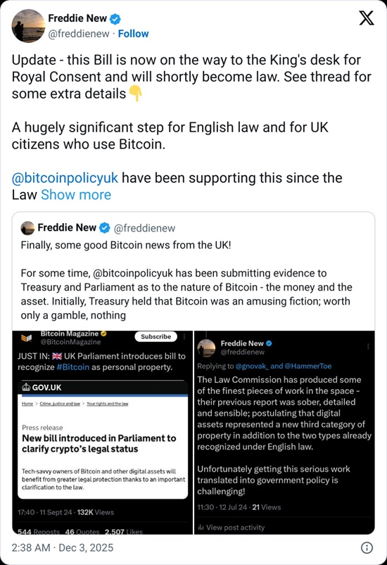 倡导组织Bitcoin Policy UK的政策负责人Freddie New在X上称,该法案“成为法律是英国的比特币以及所有在此持有并使用它的人迈出的重大一步。”