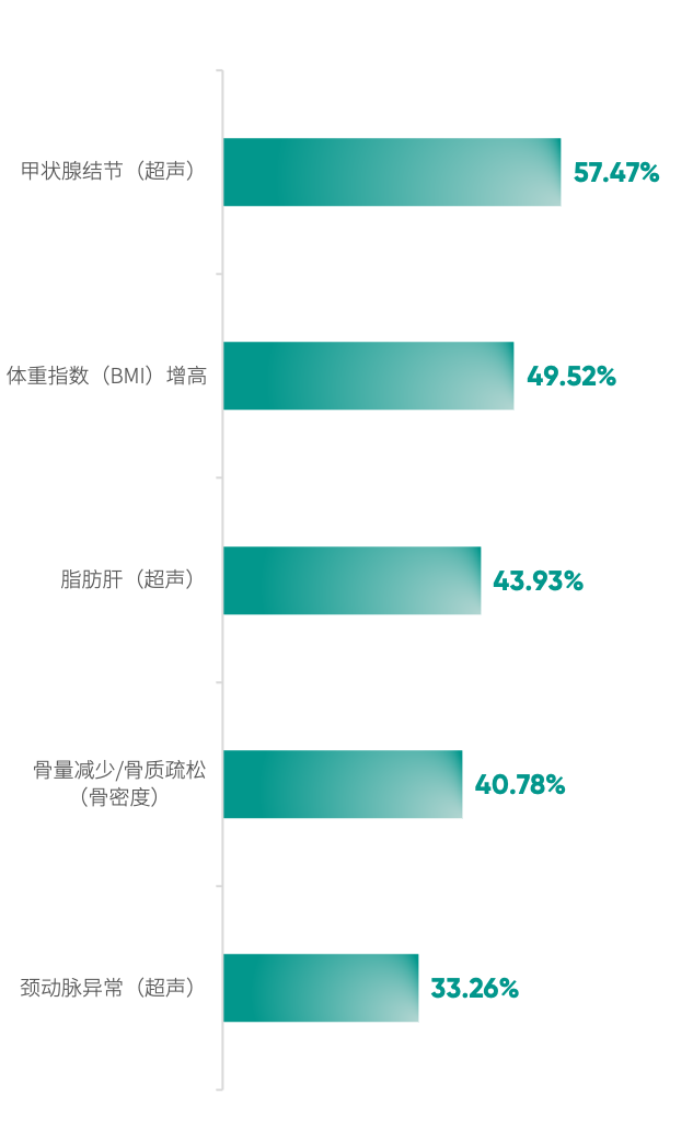 排除与性别相关的前列腺异常(超声)和乳腺结节(超声),甲状腺结节(超声)连续四年成为中国企业家面临的高发健康问题,检出率高达57.47%,往下依次为体重指数(BMI)增高、脂肪肝(超声)、骨量减少/骨质疏松(骨密度)和颈动脉异常(超声),检出率均超过三成。