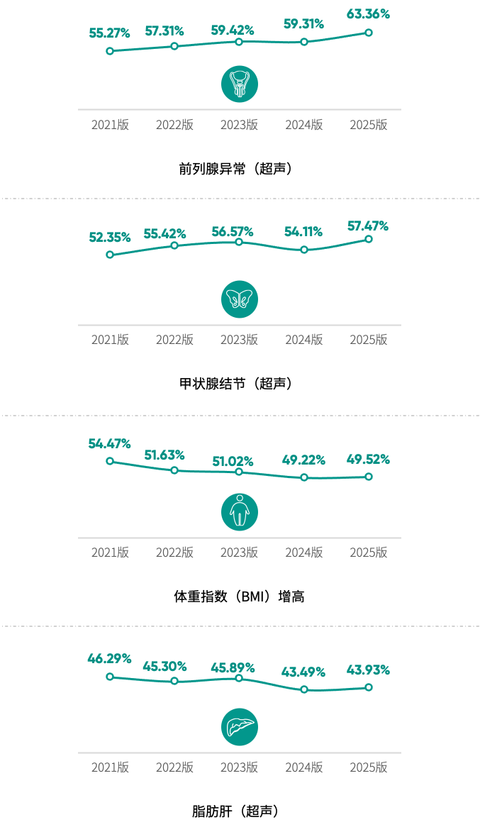 对比可见,前列腺异常(超声)、甲状腺结节(超声)、体重指数(BMI)增高和脂肪肝(超声)连续五年检出率均超过四成。此外,乳腺结节(超声)检出率连年走高;甘油三酯(TG)增高、宫颈异常(妇科检查)、幽门螺杆菌检测(呼气试验)阳性、糖化血红蛋白(HbA1c)增高和高血压连续五年检出率呈逐年下降趋势。建立健康的生活方式并合理用药将有助于这些异常指标的进一步改善。