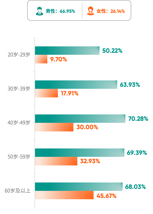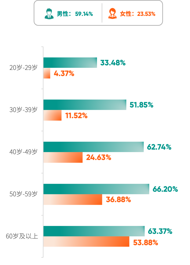 男性企业家最难逃的是“发福魔咒”,66.95%的体重指数(BMI)增高检出率是女性的2.56倍,且在各个年龄段的检出率均超过五成,并高于女性。