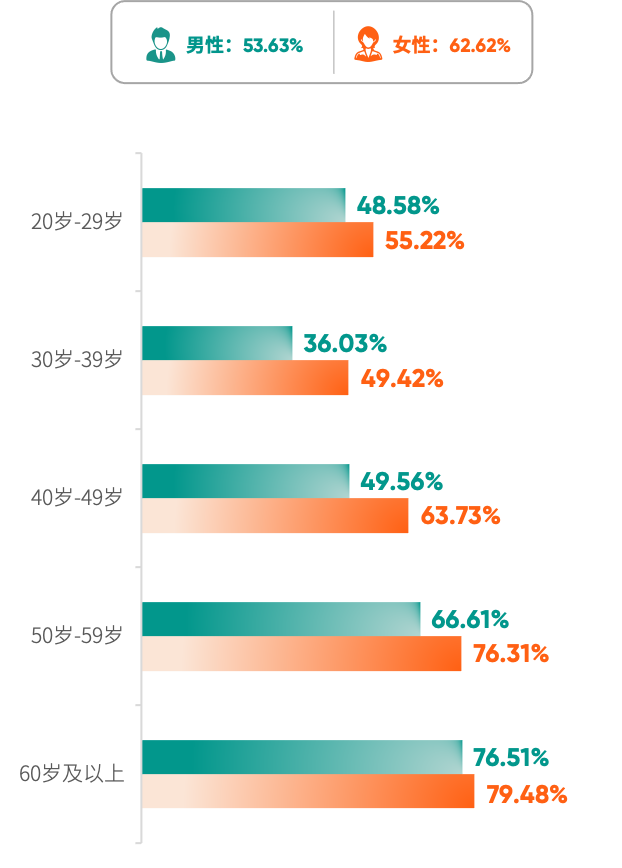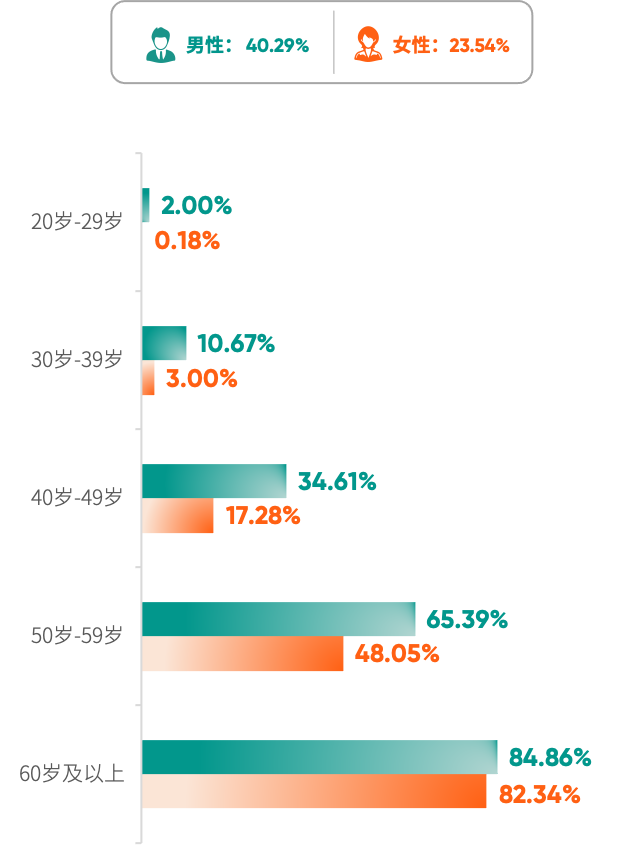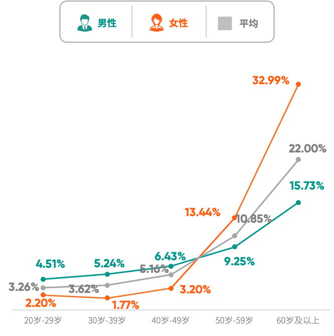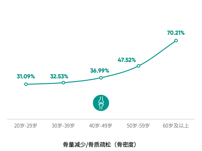 从50岁开始,女性企业家的骨质疏松(骨密度)检出率高于男性,60岁及以上的检出率为32.99%,高于同年龄段男性的2倍,每10人中就有超过3人骨头变“脆”,与这一年龄段的女性雌激素水平缺乏有关。