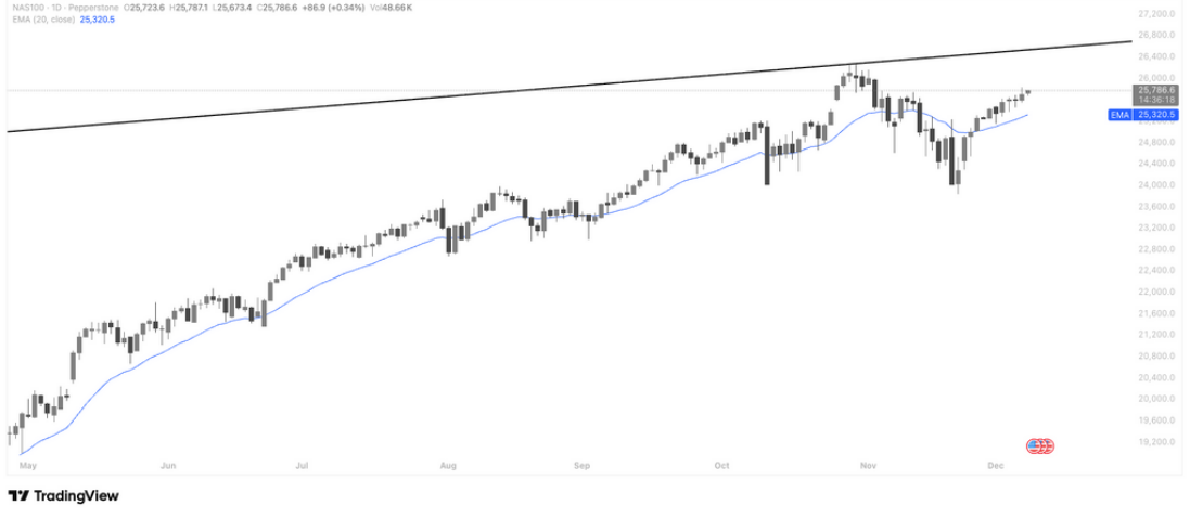 纳指在回踩后成功收复 20 日均线,短线结构重新转强,连续走高显示买盘动能回稳;目前指数正逼近自年初延伸而来的上轨趋势线压力,属于关键攻防区,若能放量突破将打开新一轮上行空间,若在压力处遇阻则可能进入高位震荡蓄势。整体趋势仍处于上升通道内,短线维持偏强,但越接近压力区越需关注节奏变化与获利了结盘的影响。