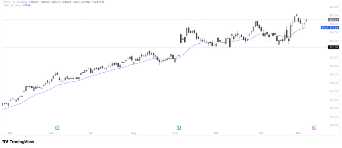 博通在财报前维持强势结构,股价自回踩 20 日均线后迅速企稳并再度向上,显示多头买盘积极承接;价格仍处于高位震荡区间上方,整体趋势保持健康。短期重点关注能否在财报催化下突破近期高点并延续上行节奏,而只要 20 日均线持续走升且不被跌破,技术面仍偏向“强势整理后再攻”的节奏。