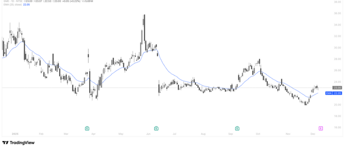 GameStop 近期自低位反弹后企稳于 20 日均线上方,短线趋势有所改善,但整体仍处于年内大区间的中下部,属于“弱势中的阶段性修复”。当前股价在 23 美元附近面临前期密集成交区阻力,而反弹力度暂未形成有效突破动力;不过均线开始走平并轻微上拐,显示空头动能已明显减弱,资金正等待财报催化决定方向。若财报兑现基本面拐点,站稳并放量突破 24–25 美元区间,有望确认短期反转;若遇阻回落,则可能重新进入 20–22 美元的震荡整理区。总体而言,技术面偏中性偏修复,方向仍需财报给出进一步信号。
