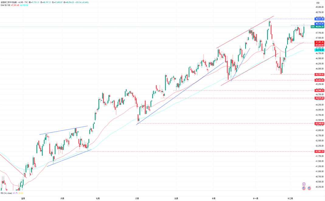 道琼指数上涨,再次开始测试48000点的整数水平,受EMA50均线的支撑,前景仍偏向看涨。上涨方面,道琼指数目前的阻力为12月11日的高点48197点,再来是11月12日的历史高点48431点。下跌方面,道琼指数目前的支撑为12月2日的低点47271点,接着为11月25日低点46341点。