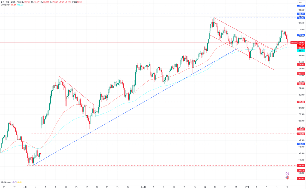 美元/日元价格自157.00水平回落,以消化RSI指针的超买讯号,并开始测试EMA50均线所在的水平。下跌方面,若跌破EMA50均线,美元/日元初步的支撑为12月5日的低点154.341,再来是11月14日低点153.613。上涨方面,美元/日元接下来的阻力12月9日的高点156.955,再来是11月20日的高点157.893。
