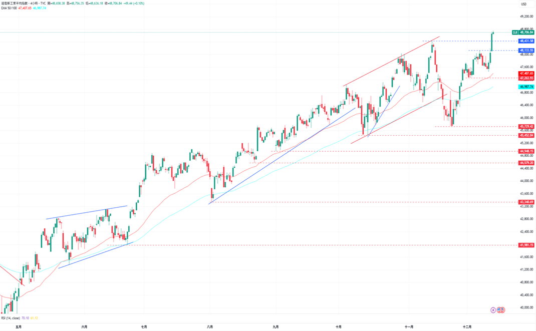 道琼指数再突破48431点后再创历史新高,须注意由于RSI指针进入超买区域,须注意短期回落的风险。上涨方面,道琼指数目前的阻力为12月11日的高点48756点,再来是49000点水平。下跌方面,道琼指数目前的支撑为12月10日的低点47462点,接着为12月2日的低点47263点。