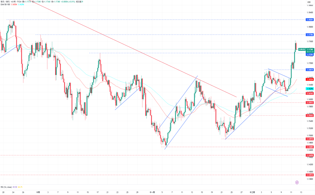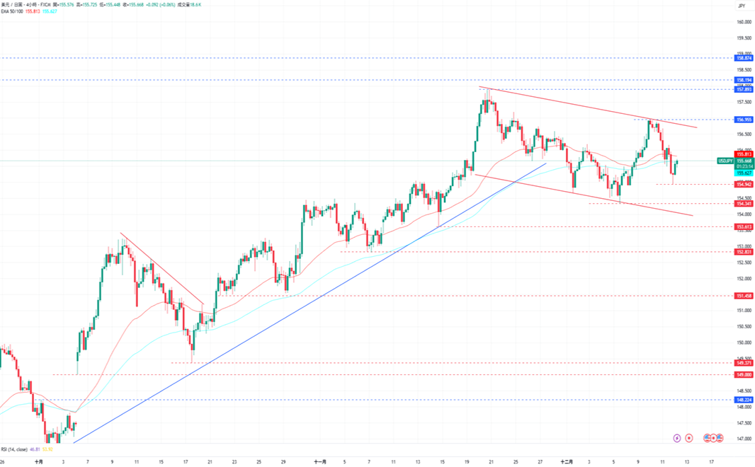 周四,美元/日元下跌至155.576日元。美元方面,根据美国劳工部最新数据,美国截至12月6日当周的初请失业金人数为23.6万人,高于市场预期的22万人,也较前值19.2万人大幅回升。另一方面,美元受到鲍威尔继任人选的猜测升温而承压,因被认为立场较鸽派的白宫经济顾问哈塞特可能遭提名,使美元面临更大下行压力。日本方面,路透社调查显示,多数经济学家预期日本央行将在12月会议上加息25个基点至0.75%,并在明年9月底前将借贷成本至少提高至1%。此前,日本央行行长植田和男指出,日本央行对前景实现的确定性正逐步提升。