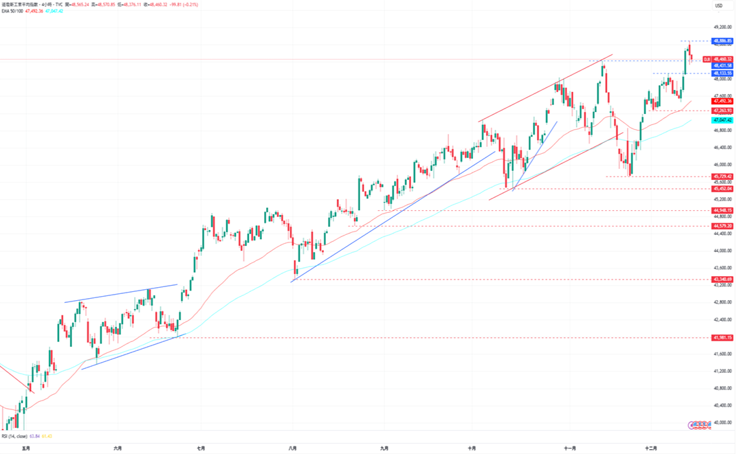 道琼指数在创下48886点的历史新高后回落,以消化RSI指针的超买讯号。上涨方面,道琼指数目前的阻力为12月12日的高点48886点,再来是49000点水平。下跌方面,道琼指数目前的支撑为12月10日的低点47462点,接着为12月2日的低点47263点。