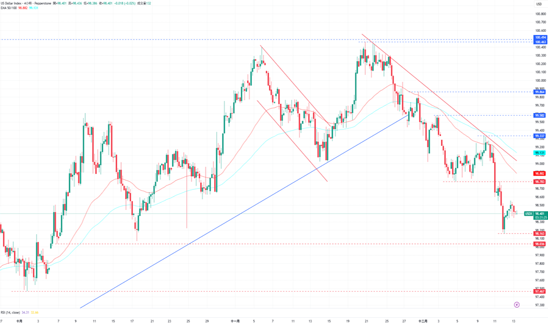 CPT Markets分析师指出,美元指数自98.163收复部分跌幅,以消化RSI指针的超卖讯号,由于价格仍低于下跌区域线以及EMA50均线,因此走势仍偏向看跌。下跌方面,美元指数接下来的支撑为12月11日的低点98.163,接着是10月17日的低点98.069。上涨方面,美元指数目前的阻力为12月11日的高点98.788,再来是12月9日的高点99.337。