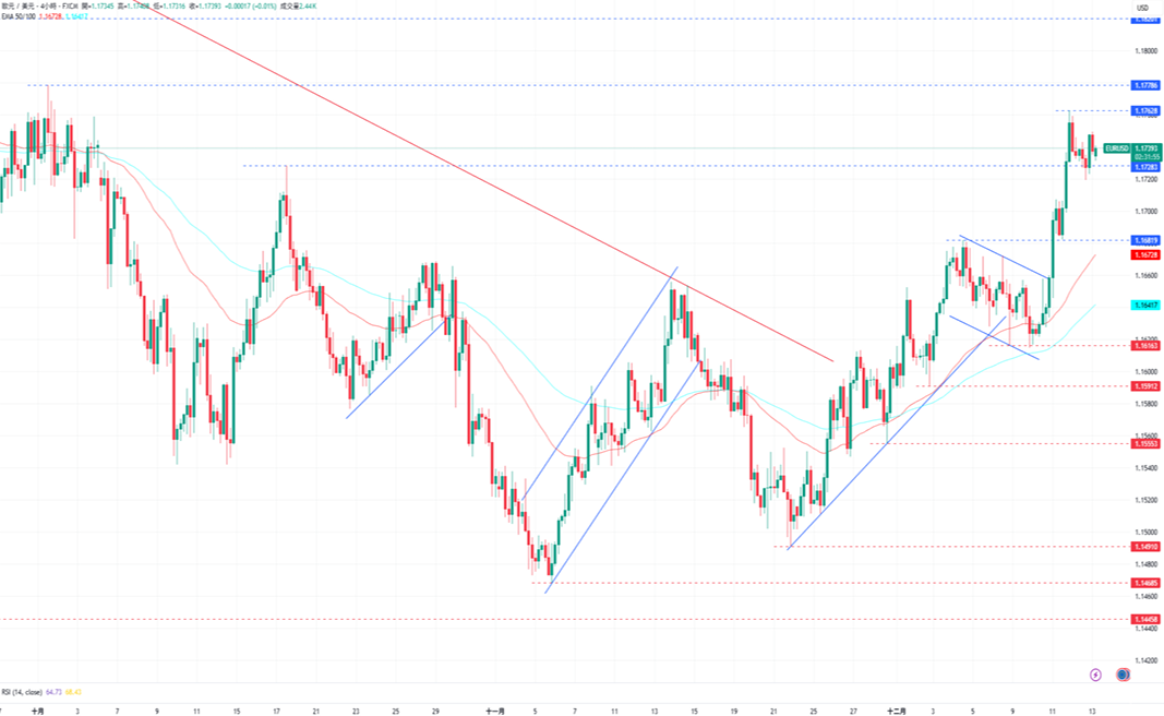 周五,欧元/美元持平于1.17376美元。美元方面,美国美联储(Fed)降息25个基点,为今年第三次降息。尽管已实施降息,但美联储暗示将暂停宽松周期。欧元区方面,市场普遍预期欧洲央行将在本周的会议上维持利率不变,投资人关注焦点集中在欧央行行长拉加德对通膨前景、经济评估以及未来政策路径的说法。数据方面,德国11月调和CPI指数月率较前月下降0.5%,符合市场预期,年率则维持在2.6%。展望后市,周一美国经济议程将公布12月纽约联储制造业指数与12月NAHB房产市场指数,而欧元区将公布德国11月批发物价指数以及欧元区10月工业产出月率。