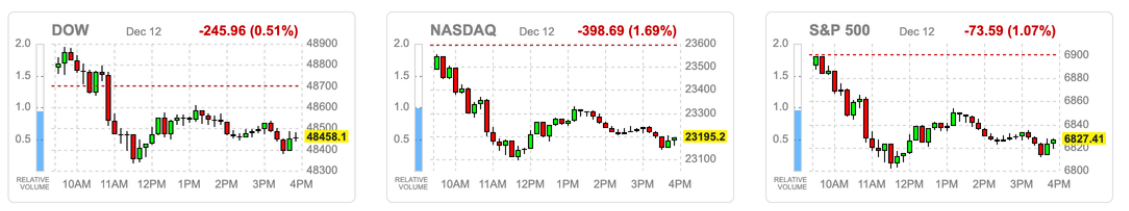 - 科技板块承压最重:跌幅集中在半导体与硬件产业链。费半大跌反映即便博通公布优于预期的财报与 AI 订单能见度,仍难以满足市场对后续收入增长和毛利率的高预期,进而拖累美光(MU)、超微(AMD)、英伟达(NVDA)等 AI 半导体与数据中心相关个股同步回调。
