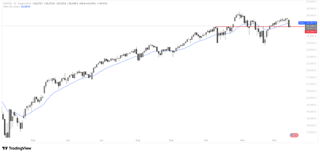 纳指日线仍维持上升趋势,但短线进入关键分歧区间,指数在 20 日 EMA(约 25,387)附近反复拉锯,显示多头动能放缓、情绪降温;当前 25,200附近构成重要结构支撑,若能守稳并重新站回均线,走势仍属趋势中的健康整理,有望再度测试前高区间;反之,一旦有效跌破该支撑,回调级别可能放大,指数或回测 24,700–24,900 区域。整体而言,趋势未破但波动上升,短线以震荡消化为主,需等待方向确认。
