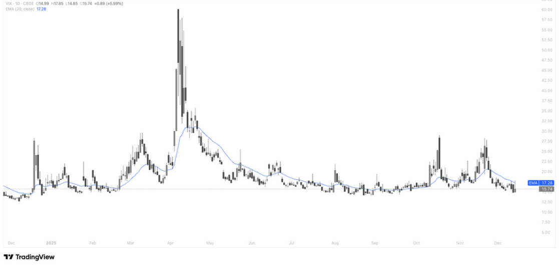 VIX 日线显示波动率正在温和抬升,指数回到 15.7 附近并仍低于 20 日均线(约 17.3),说明市场风险偏好降温但尚未进入恐慌区间;当前水平更像是对前期高位风险资产回调的正常对冲需求,而非系统性风险释放,若后续 VIX 无法有效站上 17–18 区间并持续放量,上行波动大概率仍受限,市场更偏向“震荡消化而非趋势性下跌”。