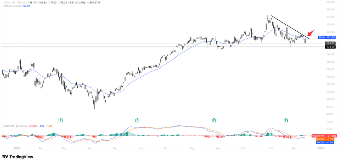 英伟达自 11 月19 日财报发布后,股价进入震荡走弱格局,整体呈现趋势性降速特征:当前价格运行在 20 日 EMA(约 183 美元)下方,并持续受制于清晰的下降趋势线压制,显示短线反弹动能受限;下方 170 美元 构成重要中期支撑,一旦有效跌破,回调级别可能进一步放大。动能指标方面,MACD 仍位于零轴下方,修复尚未完成,反映市场仍在消化高估值压力及 AI 投资回报预期降温的影响。整体结构更偏向高位回撤后的技术性整理,短期方向仍需等待趋势线突破或关键支撑的有效确认。