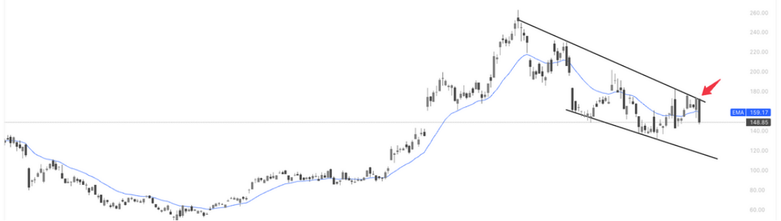 ALAB 周五在上攻上方压力线时未能形成有效突破,且伴随放量回落,表明回调趋势仍在延续;当前股价运行于 20 日 EMA(约 159)下方,趋势动能偏弱,空方仍占据主动。整体结构更符合高位回撤后的下降通道整理形态,短线不排除进一步回踩通道下沿或前低支撑的可能。操作上建议降低仓位或平仓、以风险控制为主,耐心等待结构企稳后更合适、胜率更高的再度加仓机会。