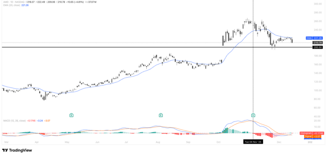 AMD 日线显示,股价在前期快速拉升后进入高位回调与震荡整理阶段:当前价格回落至 20 日 EMA(约 221)下方,短线趋势转弱,上方抛压仍在释放;下方 200 美元 构成关键中期支撑,一旦失守,回调空间可能进一步打开。动能指标方面,MACD 已跌回零轴下方,且绿柱延续,表明上涨动能明显降温,资金正从高弹性的 AI 半导体中阶段性撤出。整体结构更偏向急涨后的技术性修正,短期需观察 200 美元支撑能否企稳,或等待重新站回均线后再判断新一轮方向。