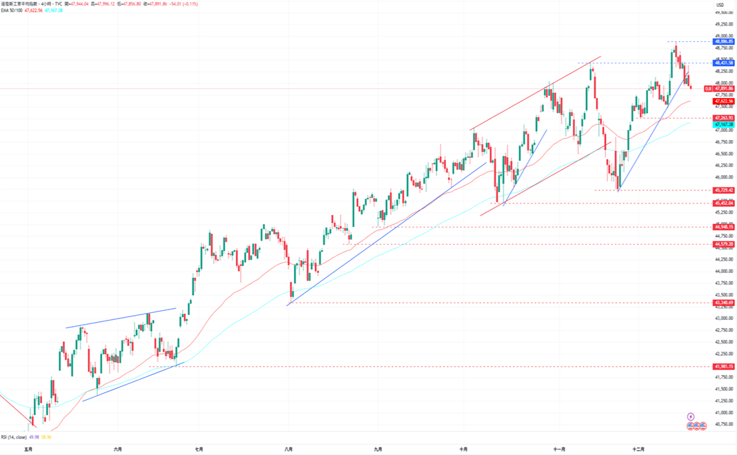 道琼指数继续自48886点开始的回落,并开始接近EMA50均线形成的动态支撑。下跌方面,道琼指数目前的支撑为12月10日的低点47462点,接着为12月2日的低点47263点。上涨方面,道琼指数目前的阻力为12月17日的高点48387点,再来是12月12日的高点48886点。