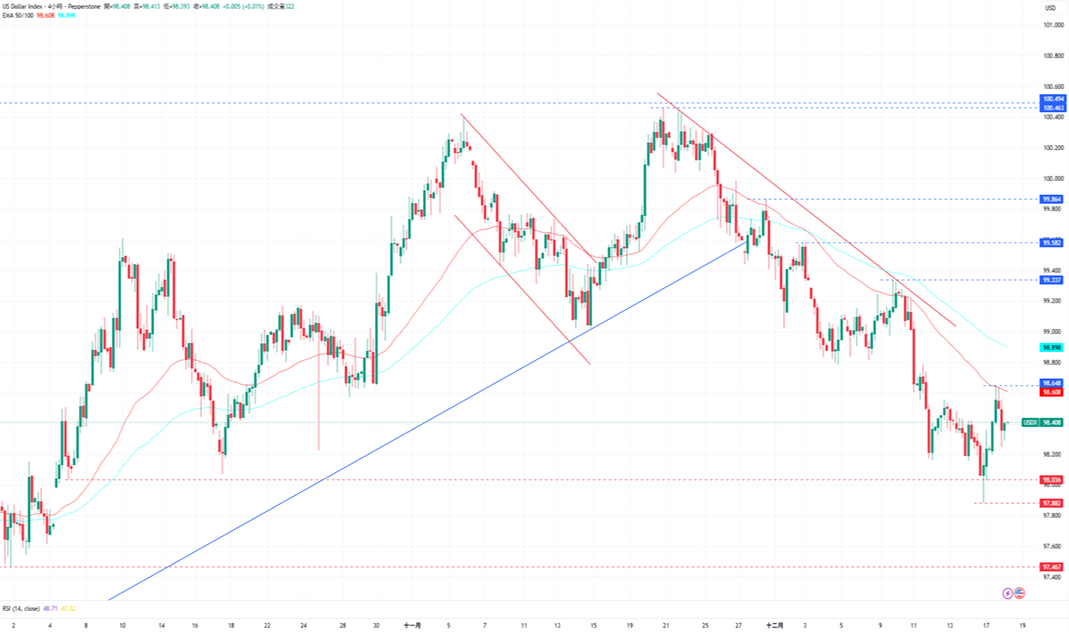 CPT Markets分析师指出,美元指数在接触到EMA50均线形成的动态阻力后再度下跌,由于价格仍保持在EMA50均线下方,因此走势仍偏向看跌。下跌方面,美元指数接下来的支撑为12月16日的低点97.882,接着是10月1日的低点97.467。上涨方面,美元指数目前的阻力为12月17日的高点98.648,再来是12月19日的高点99.337。