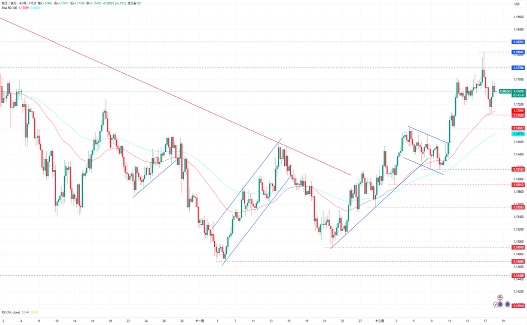 周三,欧元/美元下跌至1.17403美元。欧元区方面,市场聚焦于欧洲央行周四的利率决议。由于市场普遍预期政策制定者将维持利率不变,投资人将关注行长克里斯蒂娜·拉加德的新闻发布会,以获取欧洲央行2026年货币政策路径的最新指引。数据方面,德国Ifo商业景气指数由11月修订后的88降至12月的87.6,低于市场预期的88.2,同时,市场持续关注俄乌冲突对欧元的影响。近日欧洲多国与乌克兰相继讨论如何动用被冻结的俄罗斯资产以重建乌克兰,而俄罗斯央行亦采取反制行动,对欧洲清算银行提起诉讼。美国方面,周四美国将公布11月CPI指数以及当周初请失业金人数。