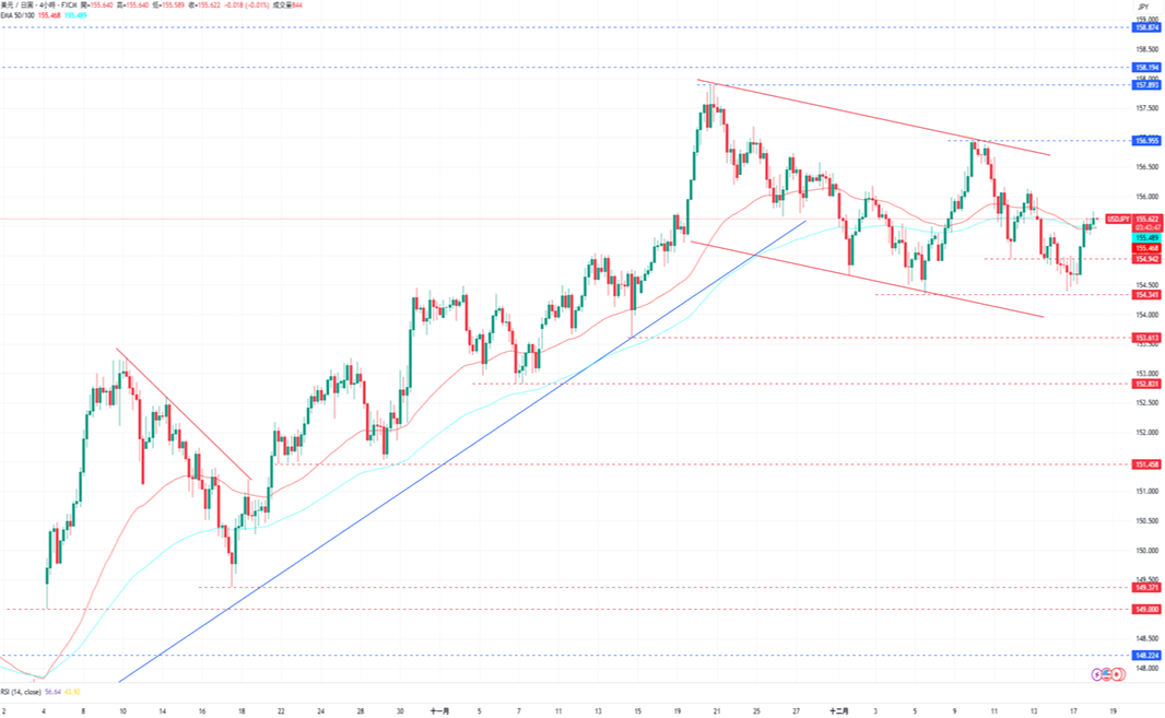 美元/日元价格自154.394反弹,并开始测试EMA50均线形成的动态阻力。上涨方面,美元/日元接下来的阻力12月12日的高点156.128,再来是12月9日的高点156.955。下跌方面,美元/日元初步的支撑为12月16日的低点154.394,再来是11月14日的低点153.613。