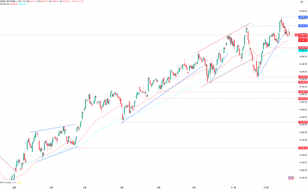 道琼指数保持在47856点上方波动,目前的走势维持中性,若是进一步跌破EMA50与47462的低点,价格将转向看跌。下跌方面,道琼指数目前的支撑为12月10日的低点47462点,接着为12月2日的低点47263点。上涨方面,道琼指数目前的阻力为12月17日的高点48387点,再来是12月12日的高点48886点。