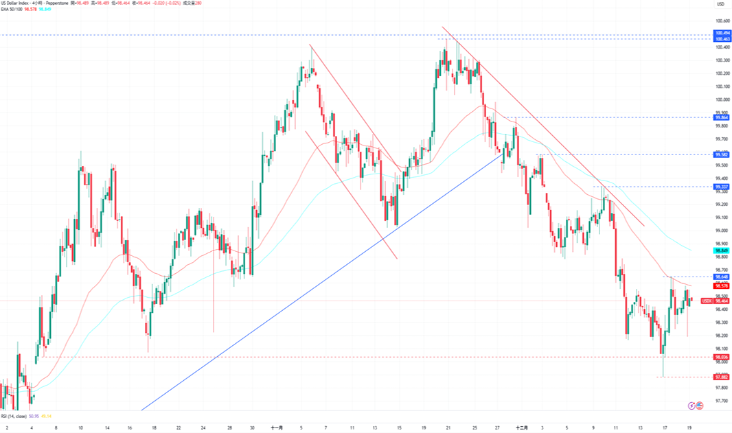 CPT Markets分析师指出,美元指数保持在96.468下方震荡,由于价格仍保持在EMA50下方移动,因此走势仍偏向看跌。下跌方面,美元指数接下来的支撑为12月18日的低点98.189,接着是12月16日的低点97.882。上涨方面,美元指数目前的阻力为12月17日的高点98.648,再来是12月19日的高点99.337。