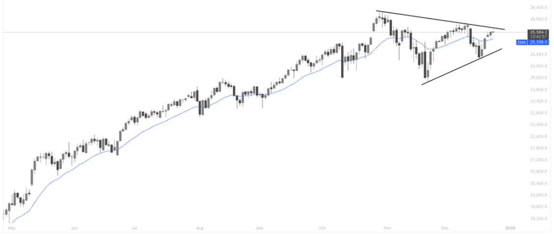 从日线结构看,NASDAQ 100 在前期强势上行后进入高位收敛区间,价格沿着下降上轨与抬升下轨运行,形成偏强的整理形态。当前指数仍稳守短期 EMA 之上,回落过程量能收敛,显示抛压有限、以消化获利盘为主;只要不有效跌破下轨与均线支撑,整体仍属多头趋势中的整理。策略上更适合跟随整理后的突破方向交易:向上突破上轨将重启趋势、打开新高空间;若跌破下轨与EMA,则需防范阶段性回调加深。