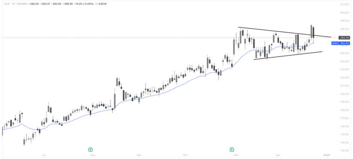First Solar 昨日回落主要属于高位整理过程中的技术性修正,价格在下探过程中仍稳守上升通道下轨与日线EMA支撑,关键结构并未被破坏。从趋势角度看,中期均线持续向上、低点逐步抬高,说明资金并未出现趋势性撤离,更像是在前期快速上涨后的获利消化。只要后续不有效跌破通道下沿与均线支撑,整体仍维持多头结构,策略上以持有观察、等待整理后方向选择为主;若量能配合重新向上突破通道上轨,则有望恢复趋势行情。