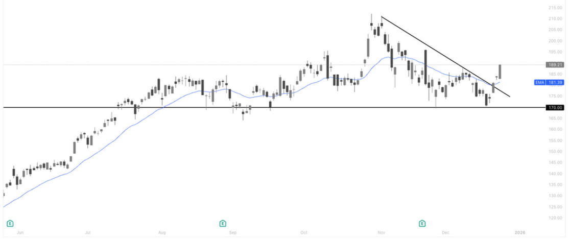 NVIDIA 在有效突破此前的下降趋势压力线后,股价反弹明显加速,短线动能快速回暖。技术结构上,突破伴随重新站稳 EMA,意味着前期整理阶段结束,空方压制被打破,趋势由修复转向主动上攻。只要价格维持在突破位之上,回踩不破压力线反抽区间,行情大概率由技术性反弹演变为趋势延续,上方将重新指向前高与历史高位区间,整体仍体现出AI核心龙头的强势特征。