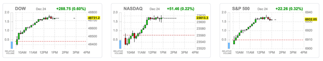 节假日前交投清淡,VIX 下探至年内低位,短周期期权与趋势型资金在低流动性环境中推动指数缓步走高;道琼斯指数收涨 0.6% 表现最佳,标普 500 与纳指分别上涨 0.3% 与 0.2%,价值股相对跑赢成长股,市场广度同步改善,近七成个股收涨。