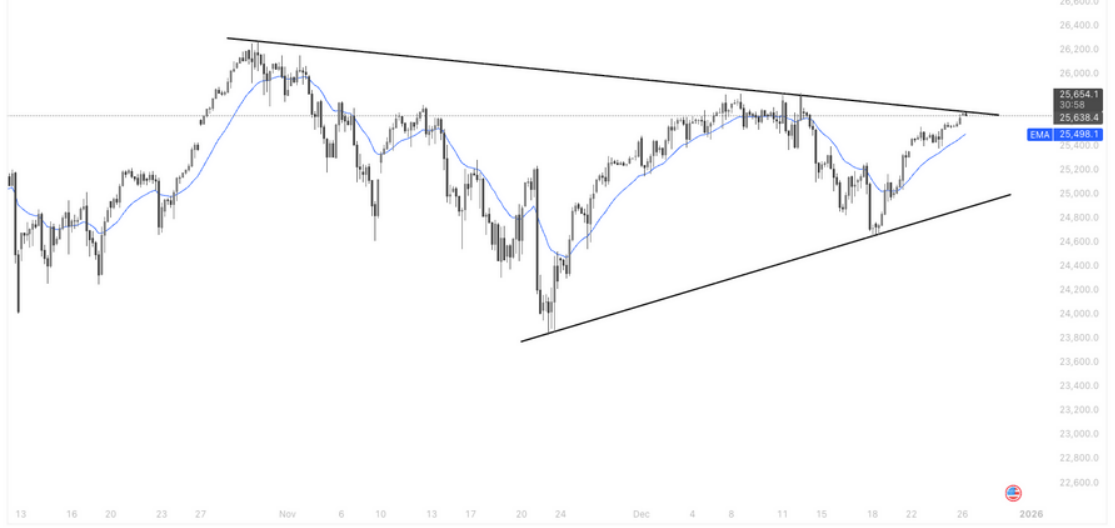 纳指100在4小时级别维持收敛三角形结构运行,价格近期回踩EMA后重新企稳并缓慢抬升,但上方仍受下降趋势线压制,短期处于典型的方向选择窗口;若有效突破趋势线并站稳25,650–25,700区域,指数有望重新进入上行趋势,反之若突破失败并跌回EMA下方,则仍将维持区间震荡,等待下一轮结构确认。