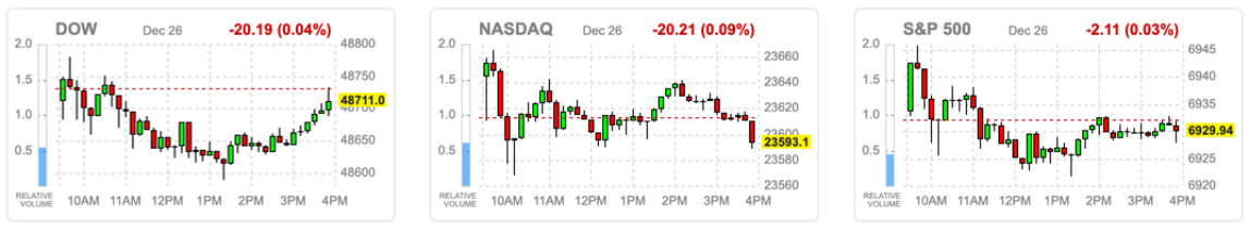 市场延续近一周由第三季度 GDP 强劲表现和企业盈利韧性所推动的多头氛围,投资者关注重心逐步转向年底“圣诞老人行情”是否仍具延续空间。由于宏观层面缺乏新的关键数据,美联储官员进入讲话真空期,指数层面动能趋弱,盘面主导力量转向个股与产业消息。标普指数在历史高位附近窄幅震荡,盘中虽一度创新高,但受年底资产再平衡影响,涨幅逐步收敛并小幅收低,道指与纳指同步回调。年末假期因素令成交量维持低位,VIX 仅温和上行,显示整体市场以资金轮动为主,属于前期强势上涨后的健康整理。
