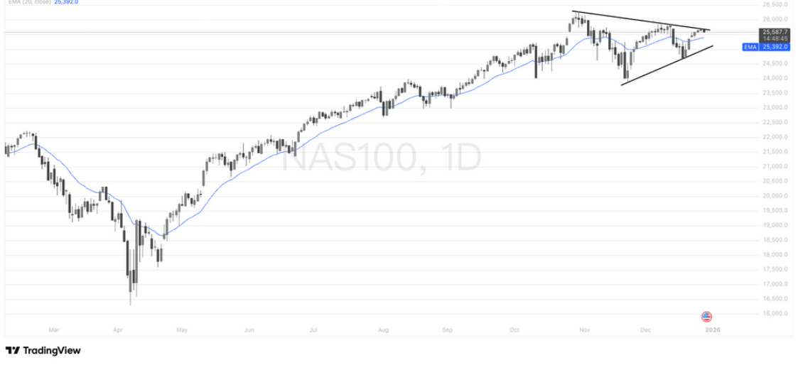 从日线结构看,纳指100在前期强势上涨后进入明显的高位整理阶段。指数自年中以来沿着 20 日 EMA 稳步上行,趋势结构保持完整,但近期高点逐步下移、低点缓慢抬升,形成典型的收敛三角形形态,反映多空力量进入阶段性均衡,市场正等待新的催化因素打破僵局。