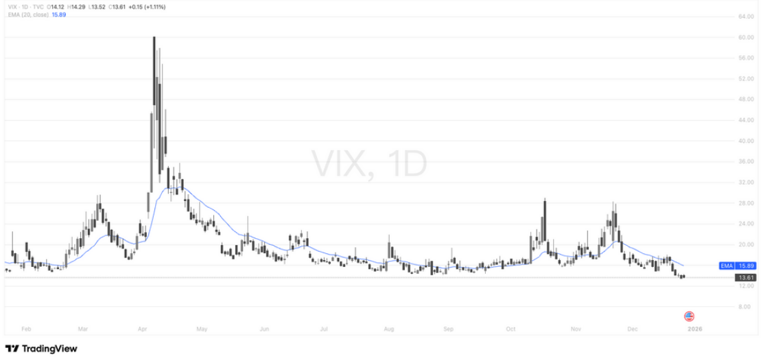 在未重新站回 16–18 区间之前,VIX 更可能维持低位钝化,而非快速反抽;这通常对应股市、加密资产与贵金属风险资产仍处于顺势或震荡偏强阶段。需要警惕的是,极低VIX本身并非风险消失,而是为后续波动“蓄能”,真正的风向变化仍需等待情绪重新拐头向上确认。