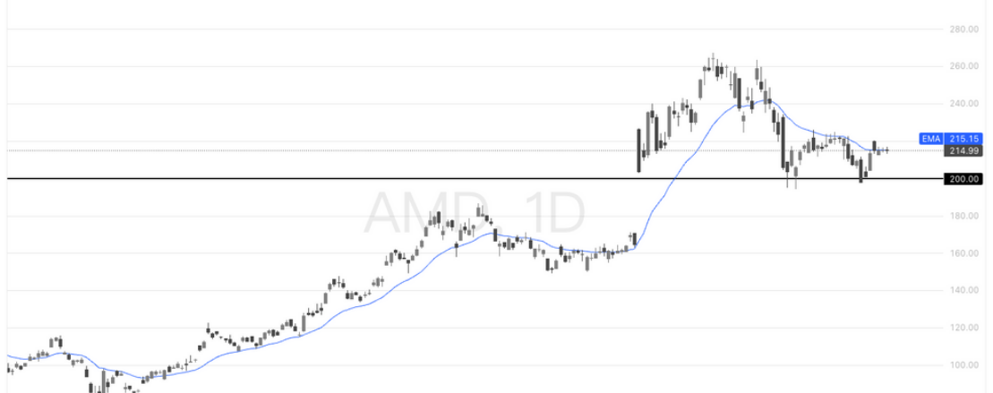 从日线结构看,AMD在前期急涨后进入明显的高位整理阶段,股价回落至 200 美元 附近获得有效支撑,显示该位置已成为重要的中期多空分水岭。但同时需要注意的是,价格当前仍运行在 20 日均线(215) 下方,均线拐头走平并对反弹形成压制,短期结构尚未重新转强。整体来看,这一段更偏向“上涨后的时间修正”:只要 200 不被有效跌破,趋势并未走坏;但只有重新站稳并收复 215–220 区域,日线级别的多头动能才算真正恢复,否则仍将以区间震荡、反复消化为主。