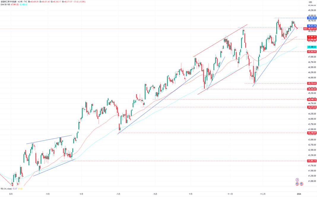 道琼指数继续自48781点回落,日内走势保持中性,受EMA50均线以及上涨趋势线的支撑,大方向仍偏向看涨。上涨方面,道琼指数目前的阻力为12月12日的高点48886点,再来是49000点水平。下跌方面,道琼指数目前的支撑为12月18日的低点47849点,接着为12月10日的低点47462点。