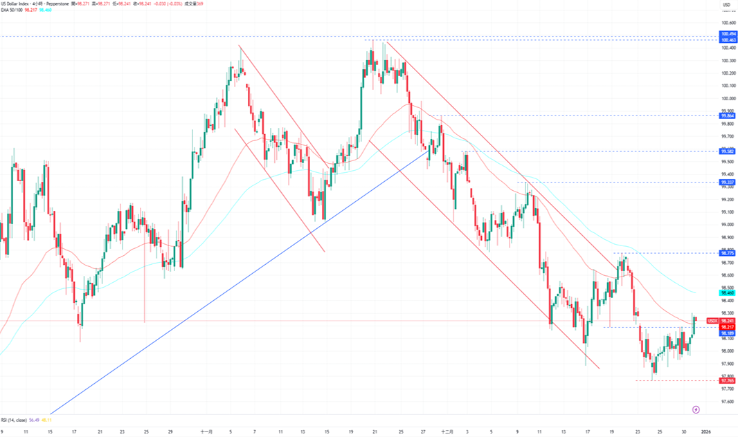 周二,衡量美元兑六种主要货币的美元指数上涨至98.241。美联储于周二公布12月会议纪录,多数官员指出,只要通膨持续放缓,后续进一步降息属于适当政策。不过,在降息的时点与幅度上,决策层仍存在明显分歧。纪要同时显示,政策声明措辞偏向保守,在缺乏进一步通膨下降数据,或失业率未出现高于预期的上升之前,美联储可能选择暂时按兵不动。根据CME「FedWatch」工具,市场预期美联储明年1月降息25个基点的机率为14.9%,维持利率不变的机率则为85.1%。数据方面,美国12月芝加哥PMI改善至43.5,高于市场预期的39.8,前值为36.3。