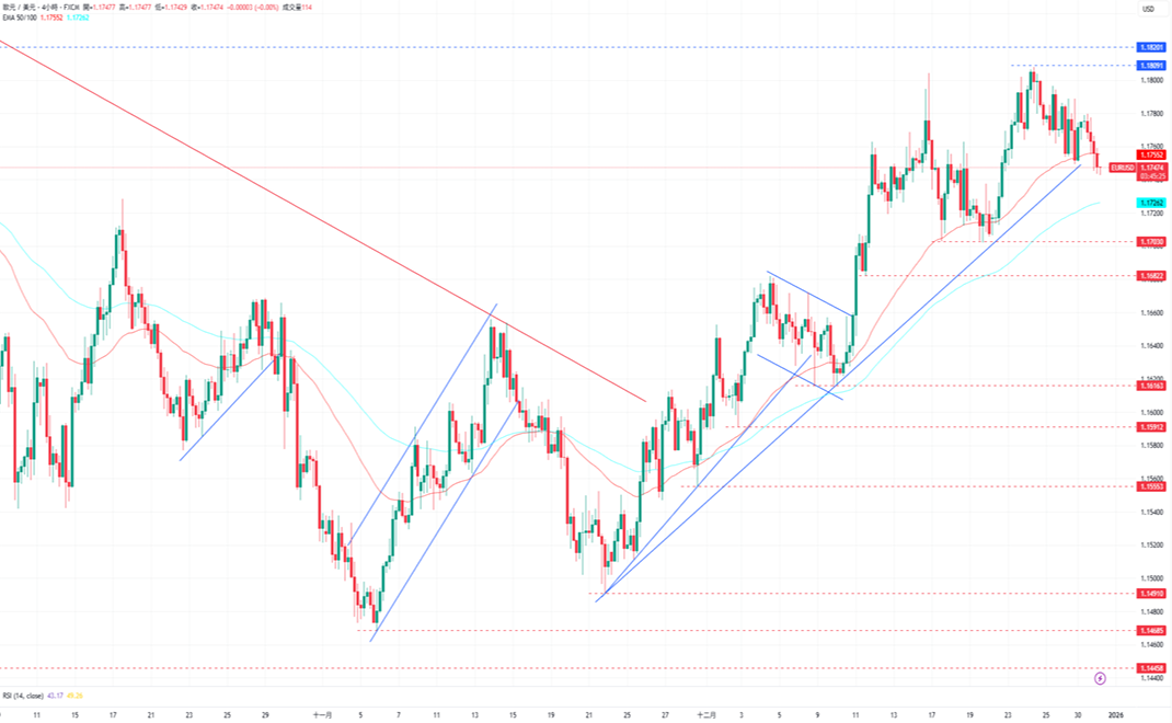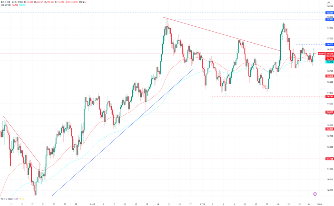 周二,由于适逢节假日,市场交易活动持续清淡,美元/日元上涨至156.329。日本方面,日本央行周一公布12月会议意见摘要,部分成员表示,日本实际利率仍处极低水平,暗示未来可能进一步升息。美国方面,美联储周二公布12月会议纪录,多数官员认为,只要通膨持续放缓,后续进一步降息属适当政策,但在降息时点与幅度上意见仍存在明显分歧。会议纪录显示,一些官员认为「在此次会议下调利率区间后,可能在一段时间内保持目标区间不变是合适的。」展望后市,美国周三将公布当周初请失业金申请人数。