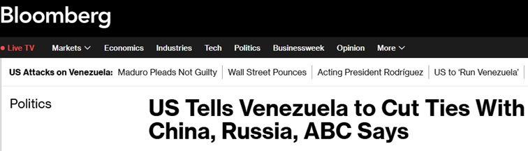 据ABC援引三位不具名知情人士报道,美国还要求委内瑞拉削弱与中国、俄罗斯、伊朗和古巴的关系。ABC称,委内瑞拉被告知必须将这四个国家“赶出去”,并切断经济联系。