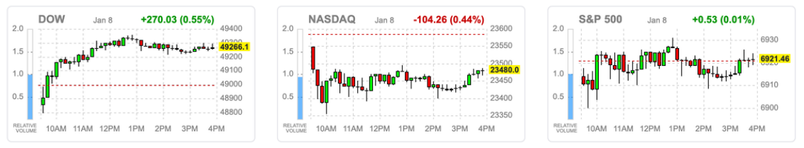 周四美股三大指数走势分化,道指收涨0.55%至49,266点,罗素2000小盘股指数大涨1.11%至2,603点,创历史新高。资金从科技板块向经济敏感领域轮动,而纳斯达克指数收跌0.44%。个股方面,MiniMax港股上市首日暴涨106%至340港元;英伟达、美光科技跌超2%,阿里巴巴则反弹5%。