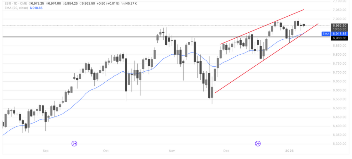 从日线结构来看,价格整体仍运行在上升通道之内,但短线动能有所放缓。当前指数回落至前期关键水平位与20日均线(EMA)附近,6900一线已由前高阻力转化为重要支撑区。只要价格能够稳守该区域,上升通道结构仍未被破坏,调整更偏向于趋势中的技术性回踩;反之,若有效跌破6900并脱离均线支撑,短线可能进入更深一层的震荡消化阶段。整体而言,中期趋势仍偏多,但短期需关注支撑位的得失与量能变化。