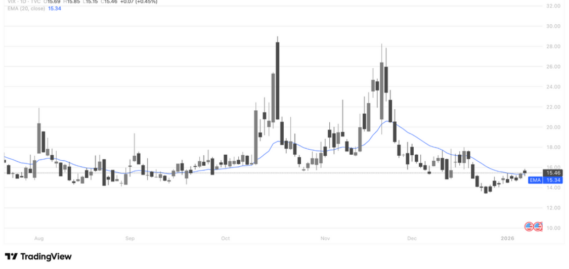 盘中 VIX 出现高开后快速回落,显示短线避险情绪并未得到持续资金确认。早盘的情绪性抬升更多反映事件或预期扰动,而非系统性风险定价重估;随着价格回落至 20 日均线附近,恐慌溢价被迅速消化。结构上看,这种“高开低走”往往对应风险偏好修复,暗示市场对回调的承接意愿仍在。