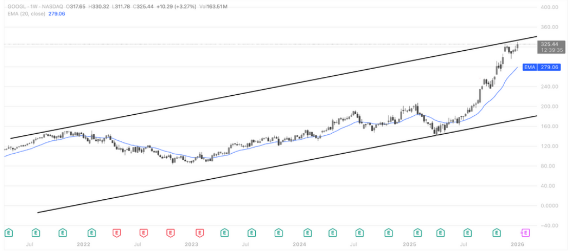 从周线结构看,Alphabet Inc. 股价在长期上升通道内持续抬升,近期放量拉升后明显远离 20 周均线,趋势动能处于加速阶段。当前价格已接近通道上沿区域,短线存在技术性整理或高位震荡的需求,但在回踩过程中,20 周均线附近将构成中期趋势的关键防守位。只要周线结构不跌破均线并维持通道内运行,整体仍属于强趋势中的顺势上涨,调整更偏向以时间换空间,而非趋势反转信号。