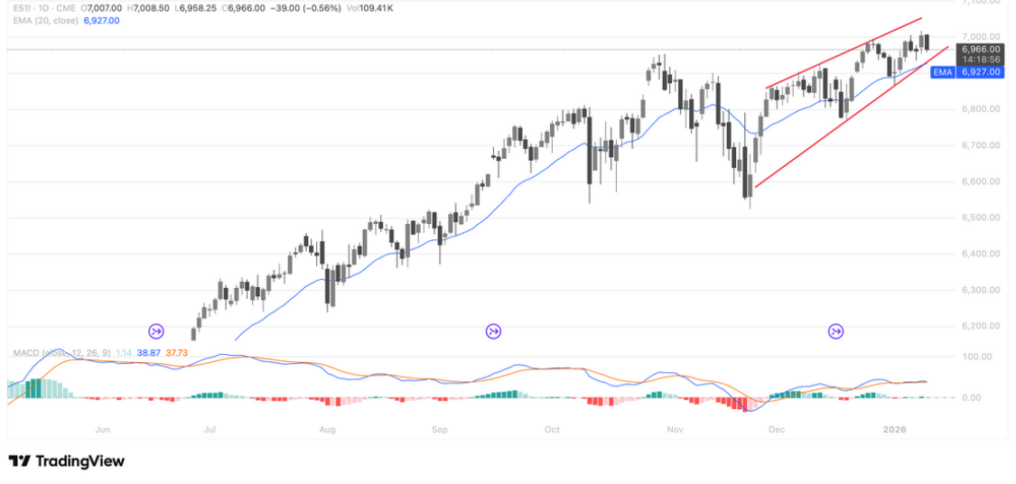 技术指标方面,MACD位于零轴上方、动能温和修复,更多体现为高位整理而非趋势反转。向上需关注7000一线及通道上轨的突破有效性,突破站稳短线可顺势做多;向下则重点观察通道下沿与20日EMA共振支撑,若跌破6900,指数可能转入更深层次震荡回调。