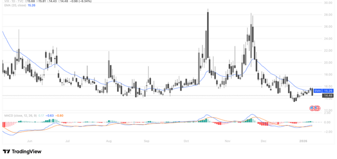 从技术面看,VIX 在前期冲高后持续回落,当前已重新压回至20日EMA附近,整体结构由“情绪冲击”转向“波动收敛”。近期低点逐步抬高,但反弹力度有限,说明恐慌情绪正在消退,而非重新酝酿新一轮系统性风险。价格运行区间明显收窄,更多体现为情绪降温后的震荡整理。
