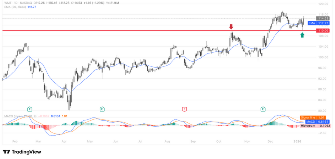 从日线结构看,110美元已完成由前期压力位向中期支撑位的关键角色转换。股价在放量突破该区间后回踩确认,未出现有效跌破,显示上方抛压已被充分吸收,筹码结构趋于稳定。当前价格稳步运行于20日EMA之上,均线保持上行斜率,趋势仍处于健康多头状态。