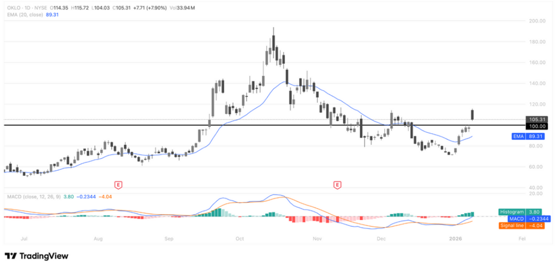 从技术面来看,OKLO 在前期大幅回落后,100美元一线成为关键结构支撑位。近期价格多次回踩该区域但未形成有效跌破,显示下方承接资金仍在,前期抛压逐步被消化。当前股价已重新站回20日EMA之上,短线结构由弱转稳,走势更偏向于下跌后的技术修复,而非延续性破位。